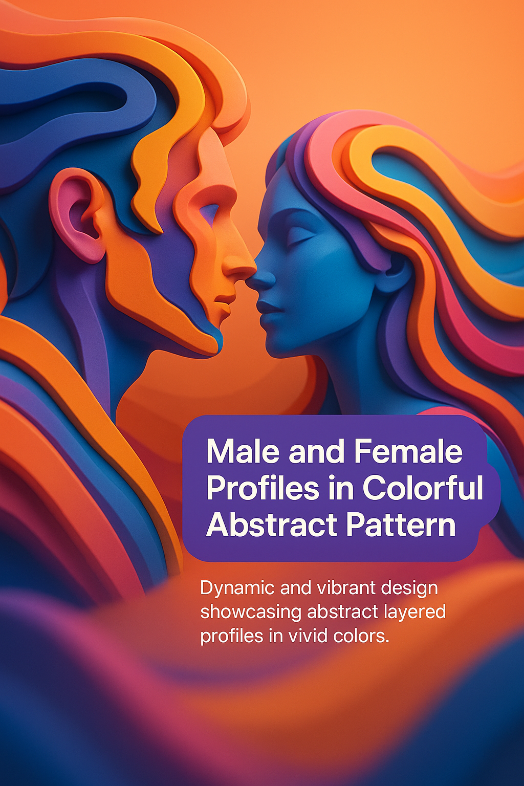 This image features a dynamic and vibrant design showcasing abstract layered profiles of male and female figures in vivid colors, ideal for artistic or creative contexts.