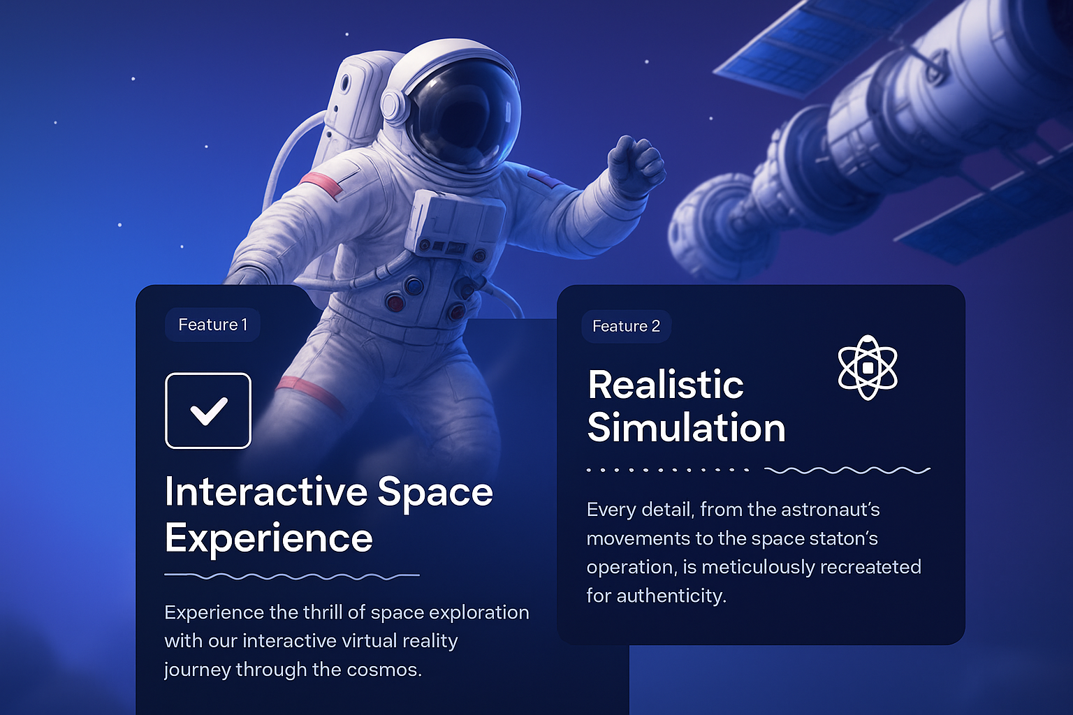 A dynamic 3D illustration featuring an astronaut in a spacesuit interacting with a space station. The image includes feature blocks for an engaging user interface.
