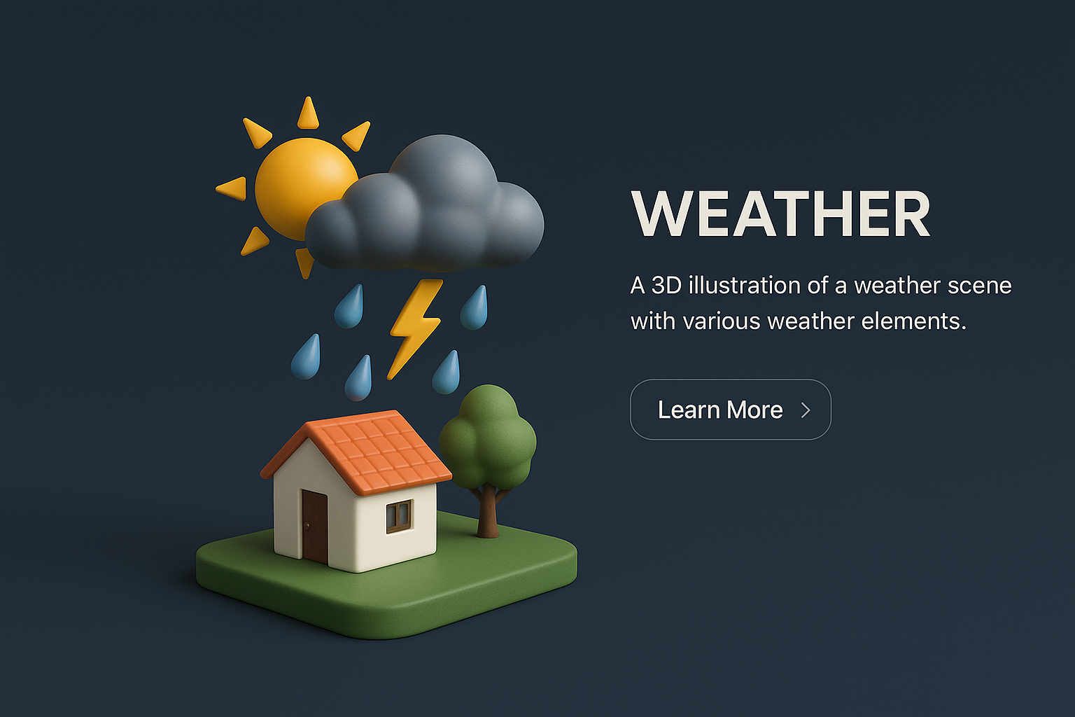 A detailed 3D illustration depicting a weather scene featuring a small house, sun, clouds, rain, and lightning. The design is realistic with a dark background.