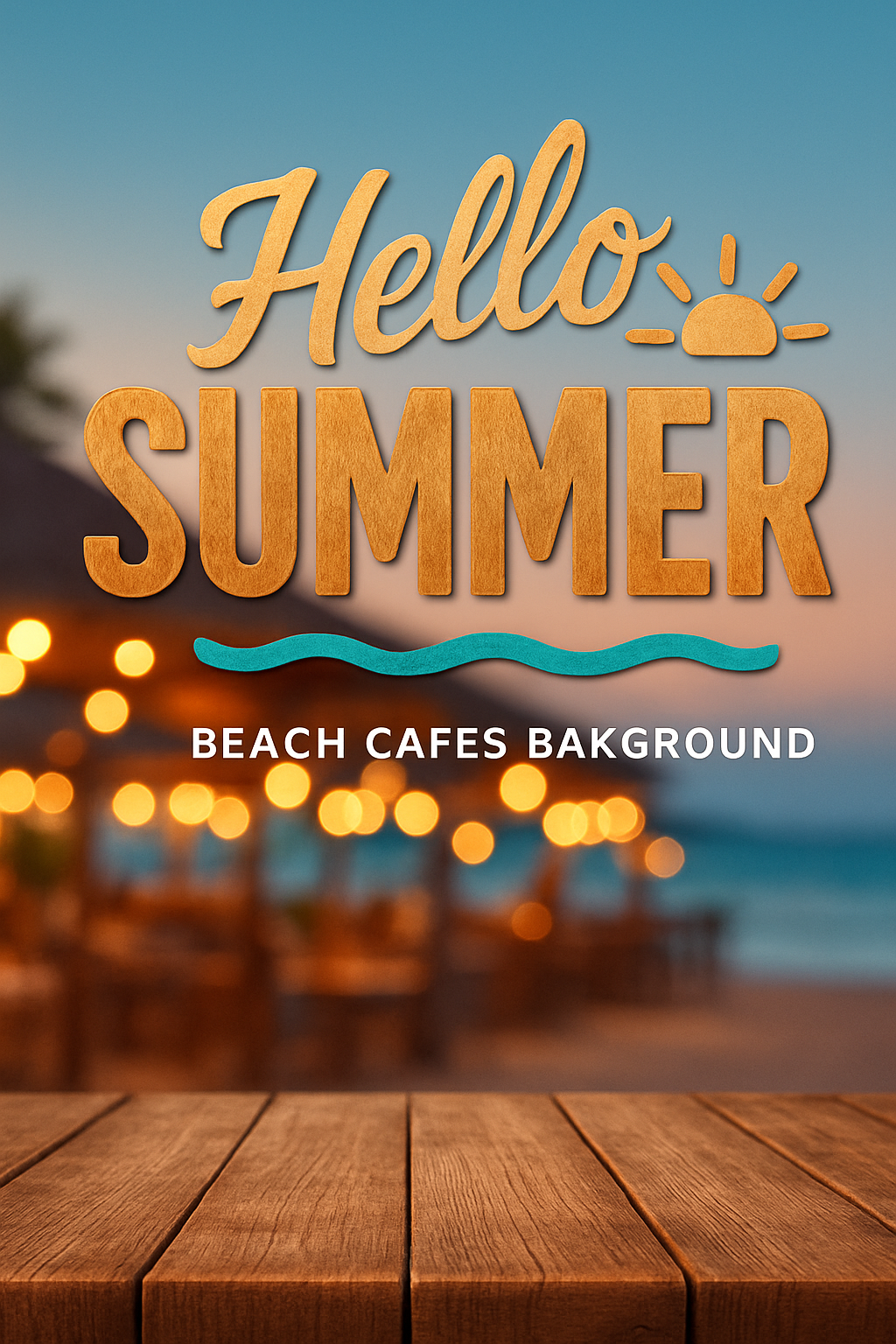 /Collection: /by davooda/Type: PNG/A lively summer-themed graphic featuring bold typography and a beach cafe setting, ideal for promotional materials or social media posts celebrating the summer season.