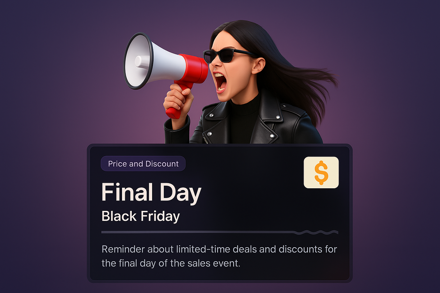 /Collection: /by davooda/Type: PNG/A fashionable brunette woman passionately announces Black Friday sales using a loudspeaker. The design features a modern layout with a prominent discount label.