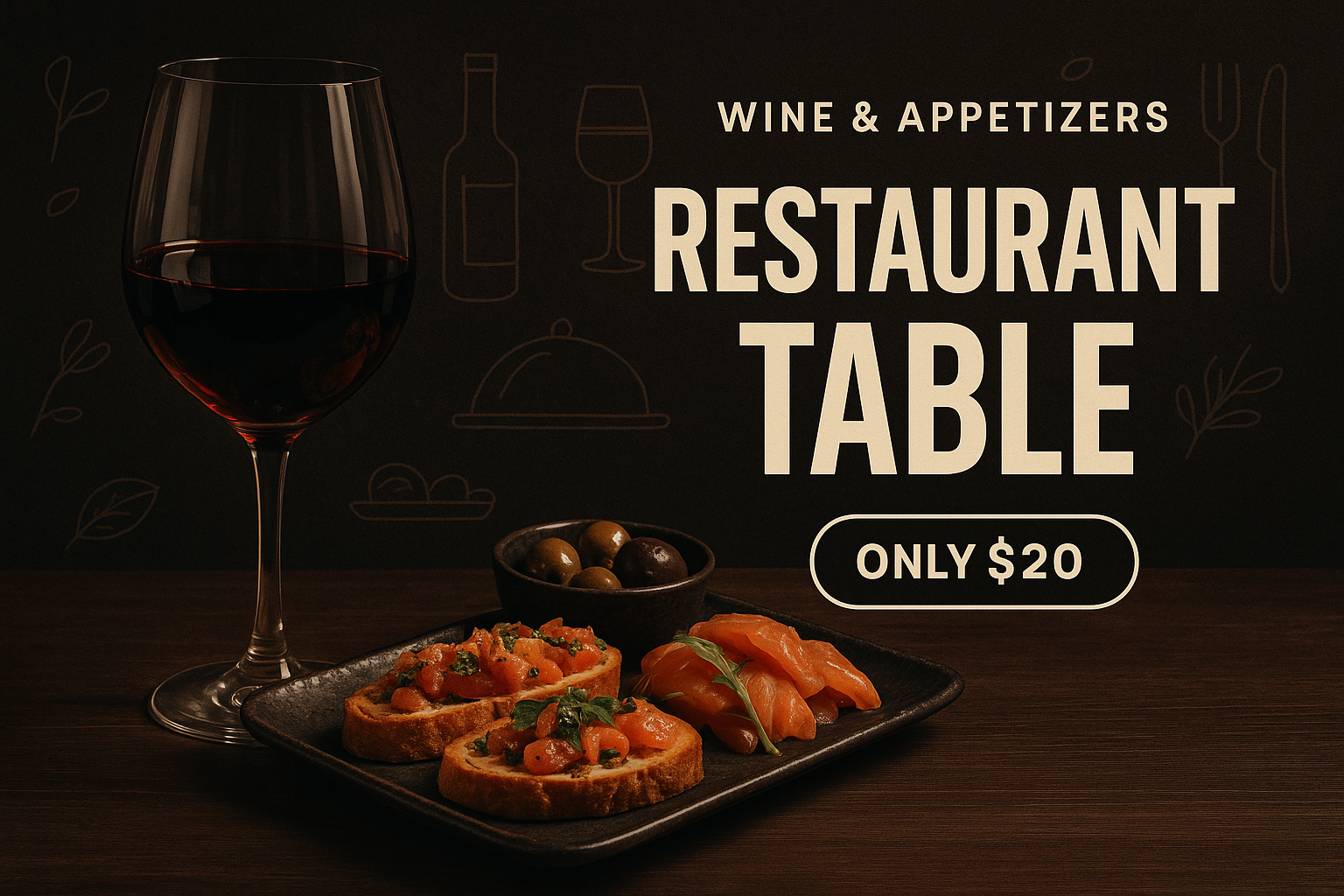 /Collection: /by davooda/Type: PNG/A sophisticated restaurant table setting featuring a glass of red wine and gourmet appetizers. The warm, soft lighting creates a romantic ambiance, enhanced by stylish typography and a dark background.