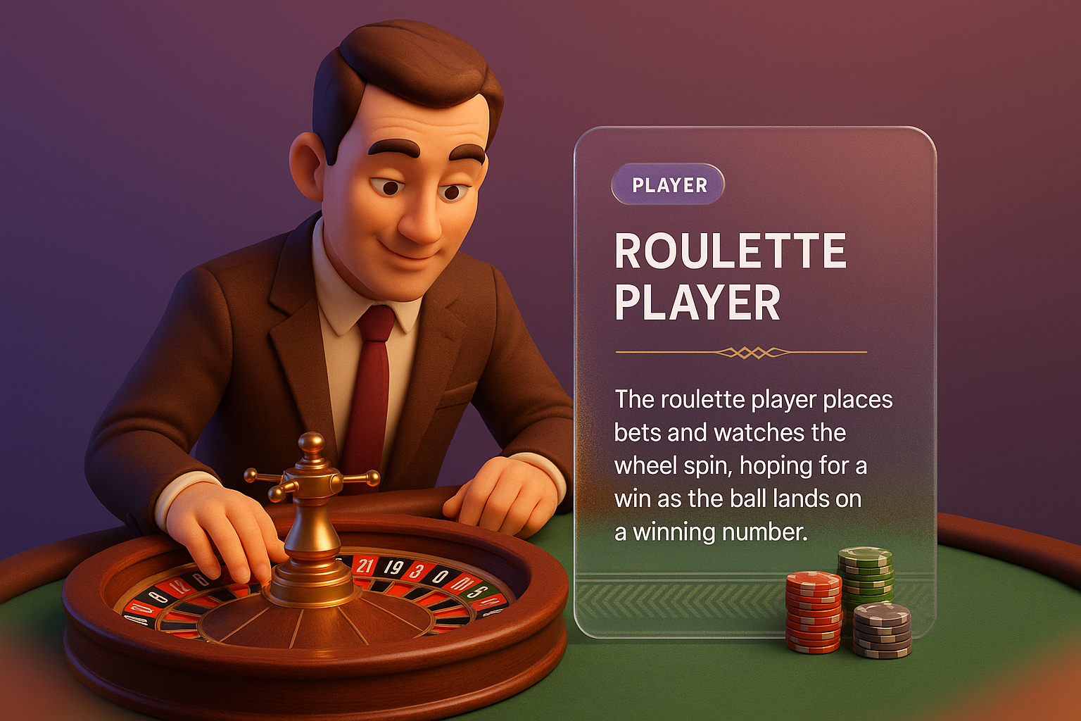 /Collection: /by davooda/Type: PNG/This 3D illustration features a roulette player intently observing the spinning wheel. The scene includes a detailed roulette table, chips, and a stylish information block.