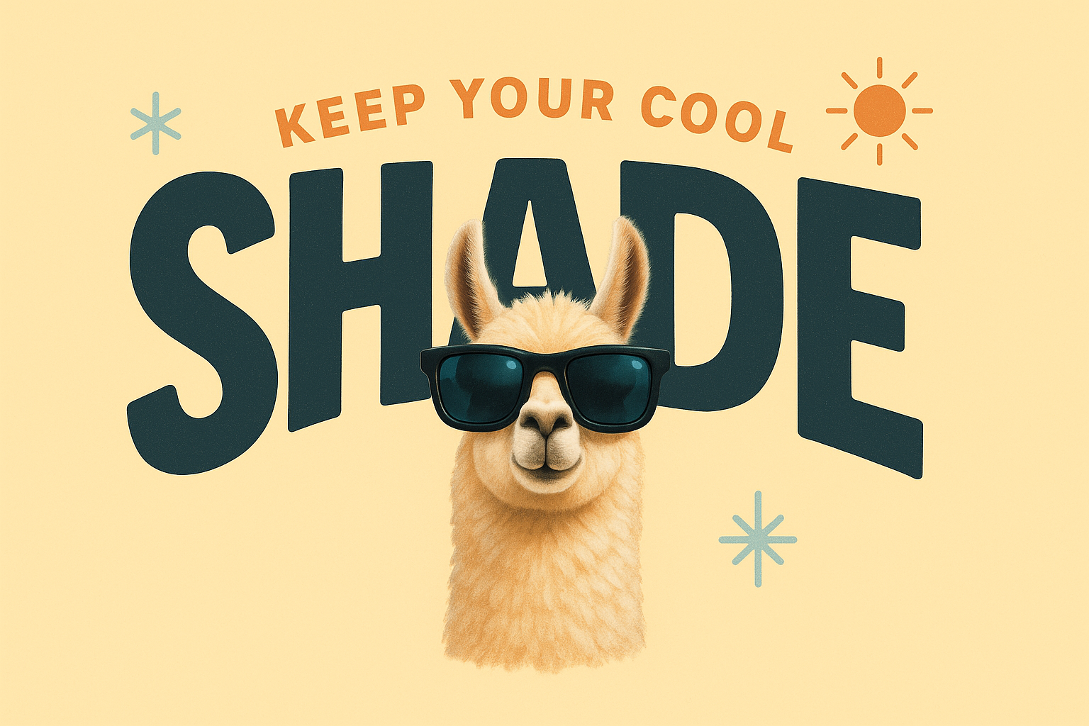 A fun and vibrant illustration featuring a llama wearing sunglasses, promoting a cool vibe with the text 'Keep Your Cool Shade.' Ideal for summer-themed designs or social media posts.
