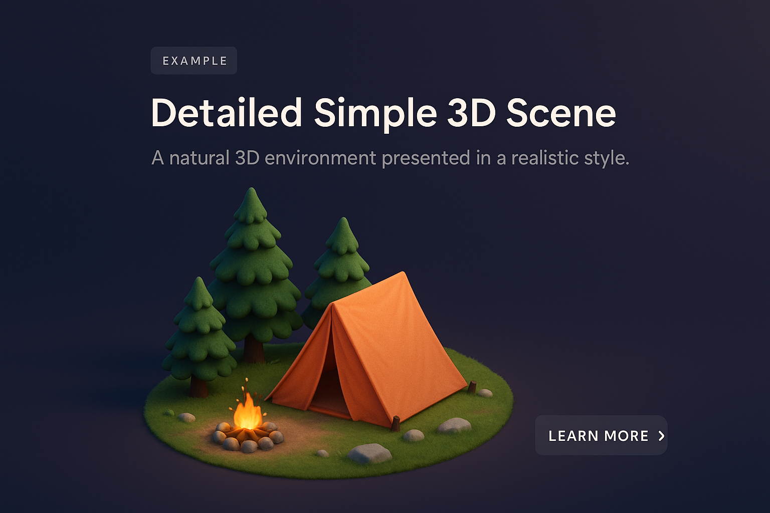 A detailed 3D representation of a camping scene featuring a vibrant orange tent, a campfire, and surrounding trees. The background is a smooth gradient, enhancing the realistic style.