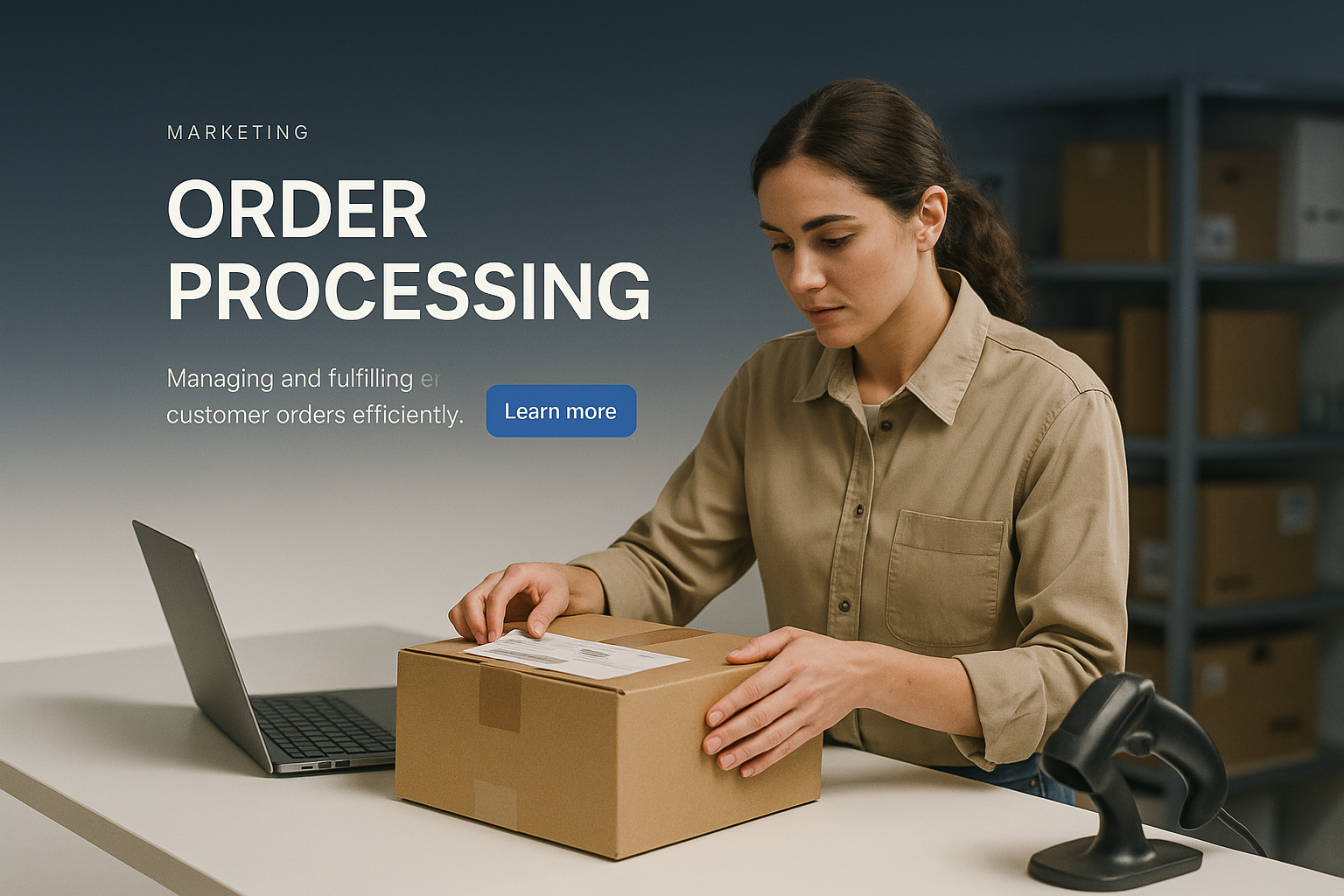 A stylish webpage design for order processing featuring a woman handling a package, a laptop, and a barcode scanner in a warehouse setting.