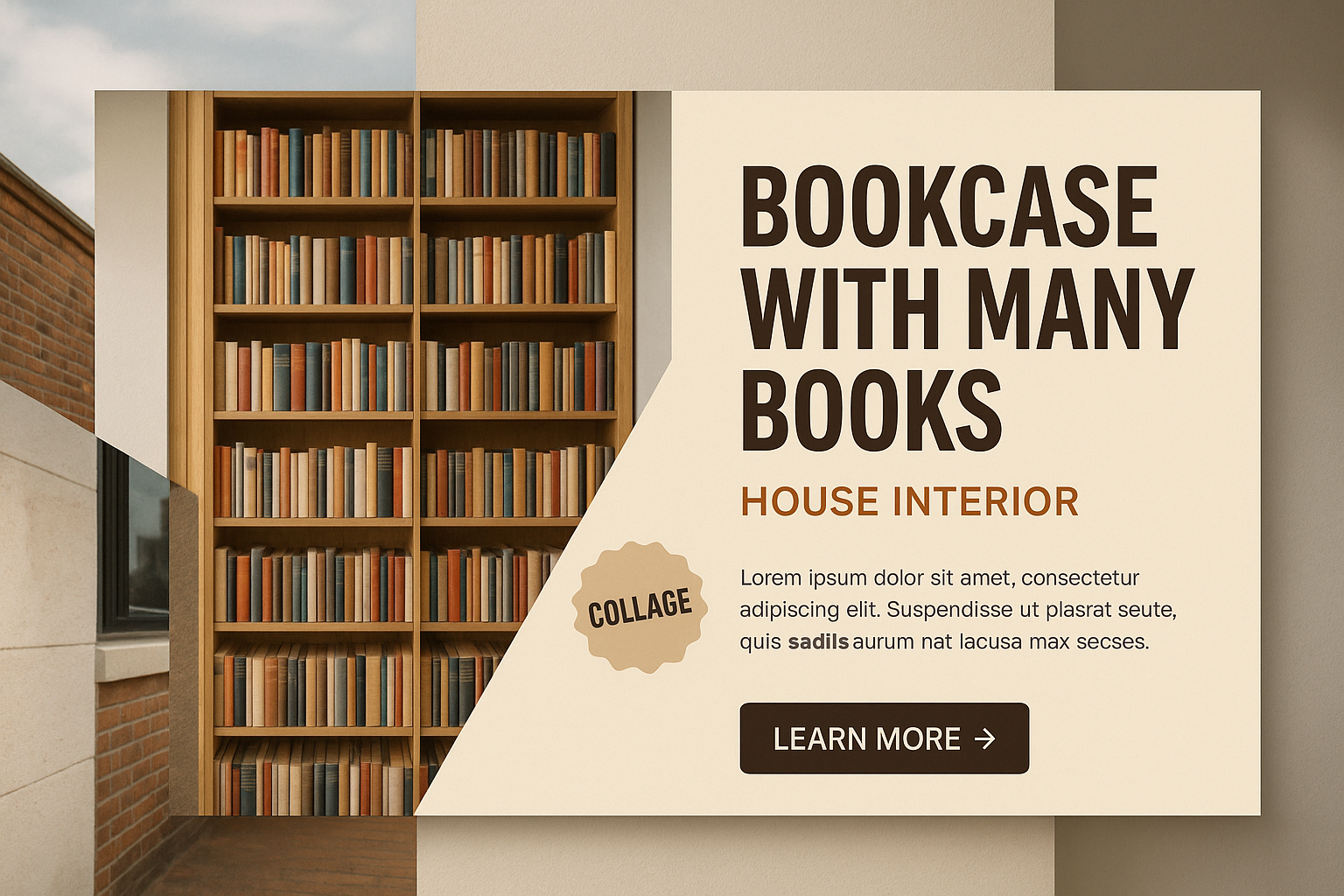 /Collection: /by davooda/Type: PNG/A visually appealing collage featuring a large bookcase filled with books, set against a stylish house interior backdrop. The design includes a call-to-action button and a unique sticker element.