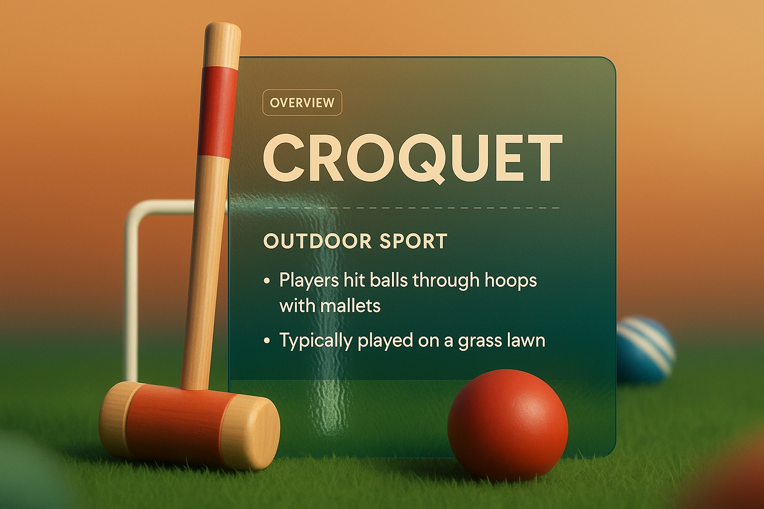 A vibrant 3D illustration showcasing croquet equipment with an informative overlay. Features mallets, balls, and a hoop, set against a smooth gradient background.