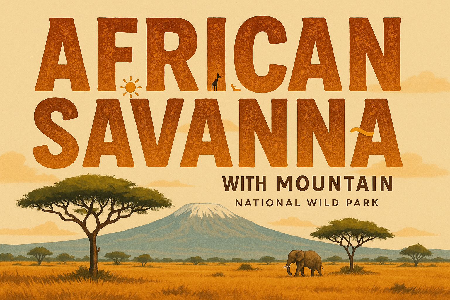 Stylized landscape poster featuring African savanna with mountain backdrop, highlighting wildlife and natural beauty, ideal for educational or decorative purposes.