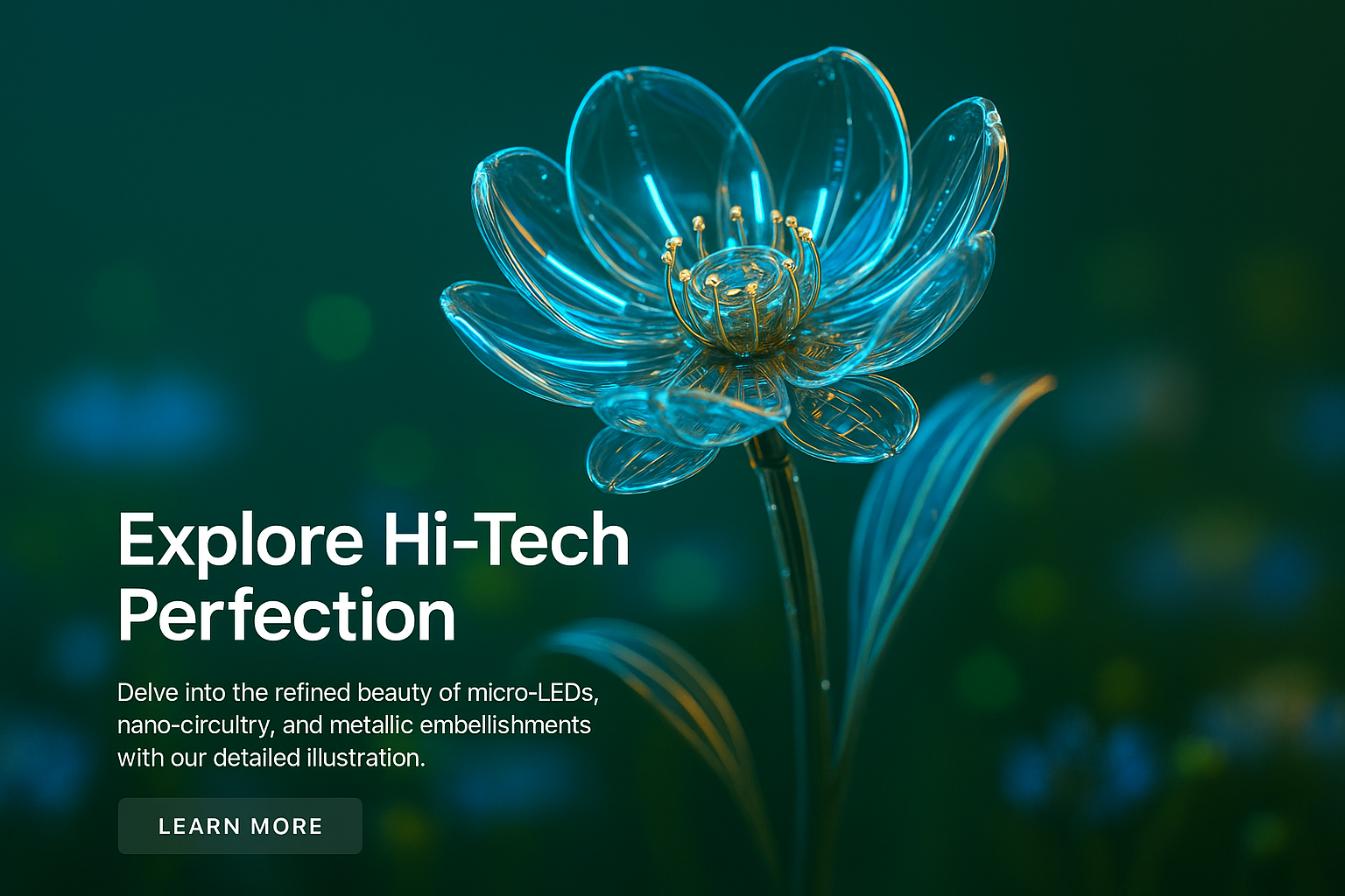 /Collection: /by davooda/Type: PNG/A hyperrealistic illustration of a flower meadow in spring, featuring a glass-like flower with glowing micro-LEDs and metallic components, enhanced by soft neon lighting.