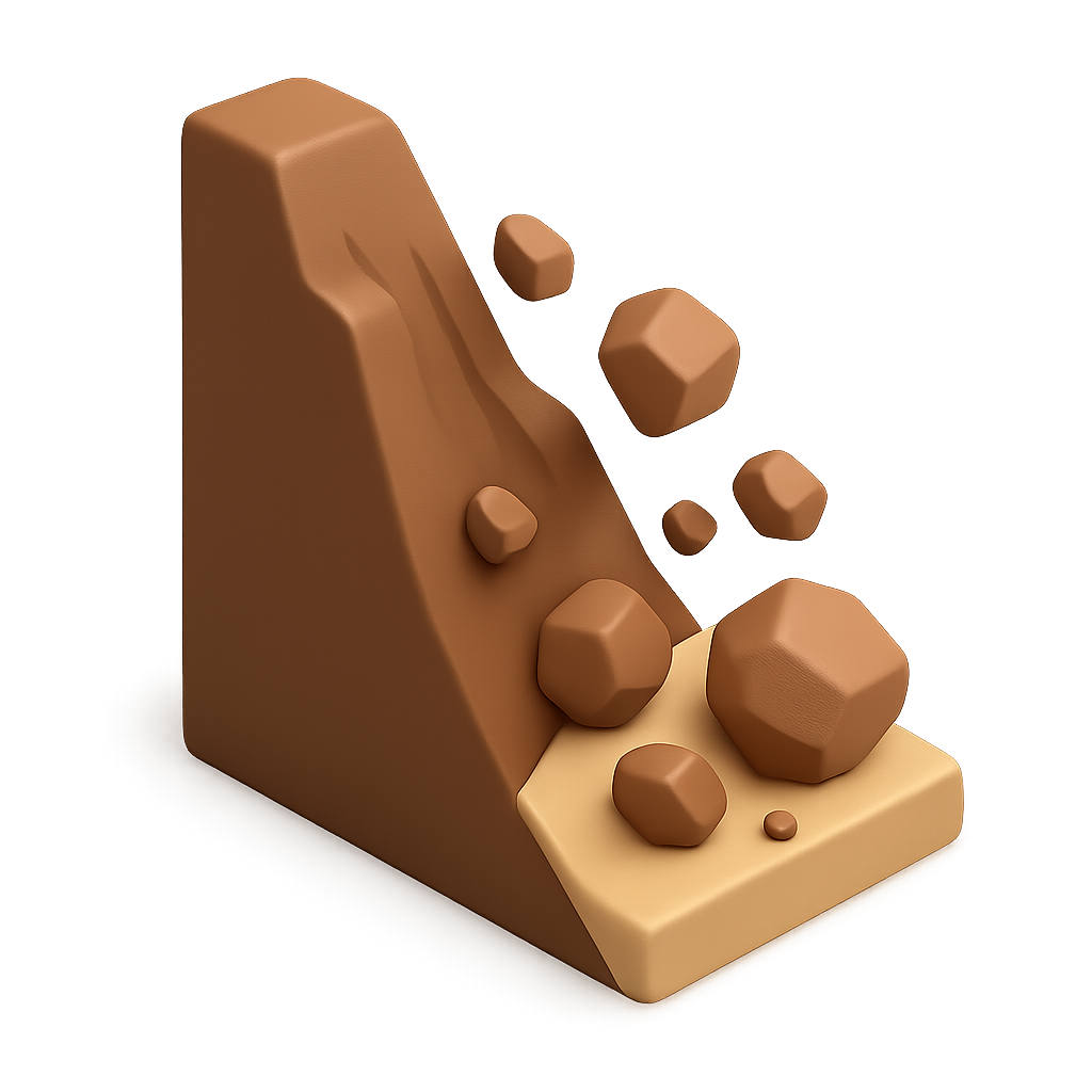 A detailed 3D icon depicting a landslide scene with tumbling rocks. The design features a three-quarter view with a transparent background, showcasing a stylized, volumetric representation.