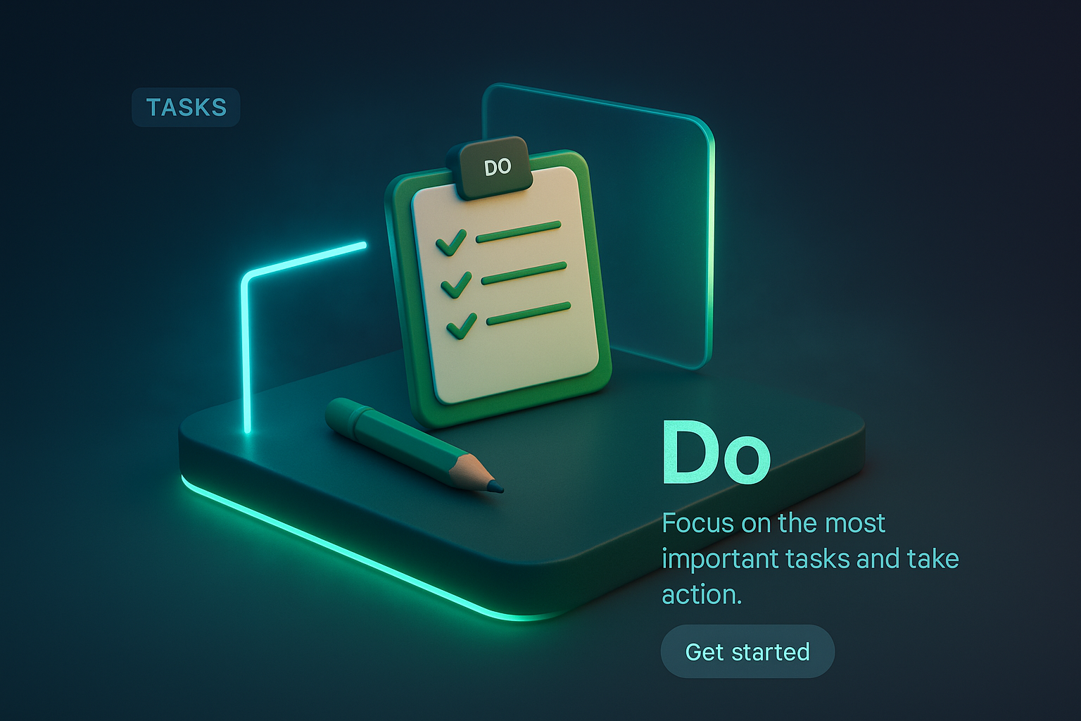 A vibrant 3D scene featuring a checklist, neon accents, and smooth gradients. The design incorporates a task label, encouraging users to focus on important actions.
