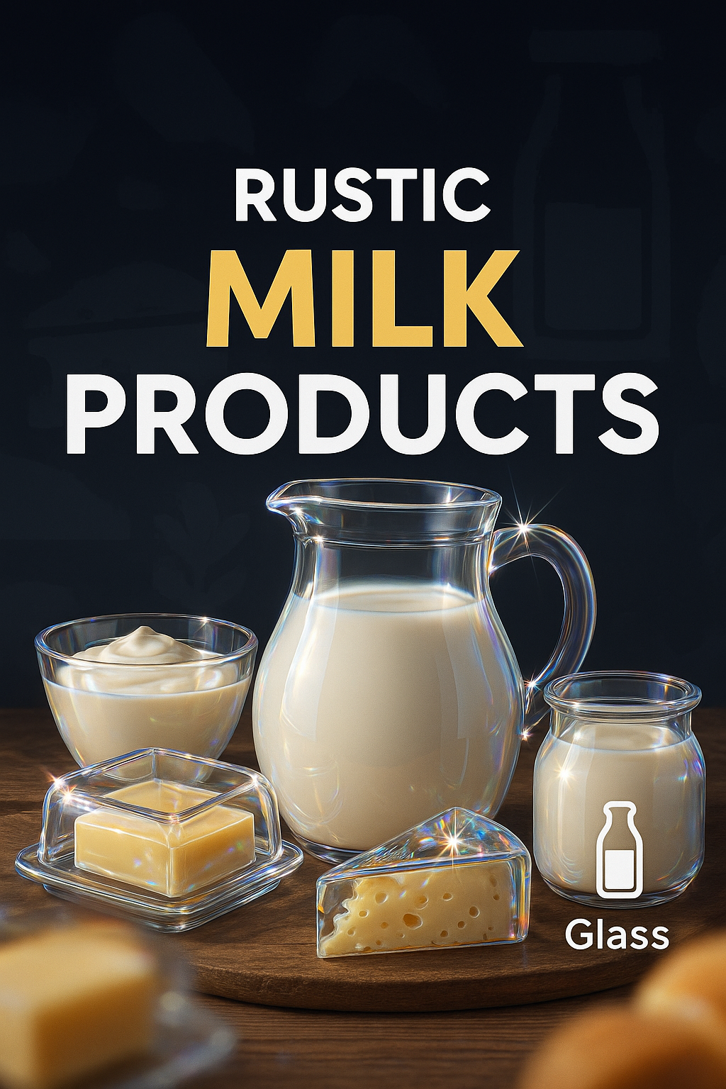 /Collection: /by davooda/Type: PNG/Stylish and rustic arrangement of various milk products including milk, cheese, and cream in glass containers. Ideal for food-related content or dairy marketing.