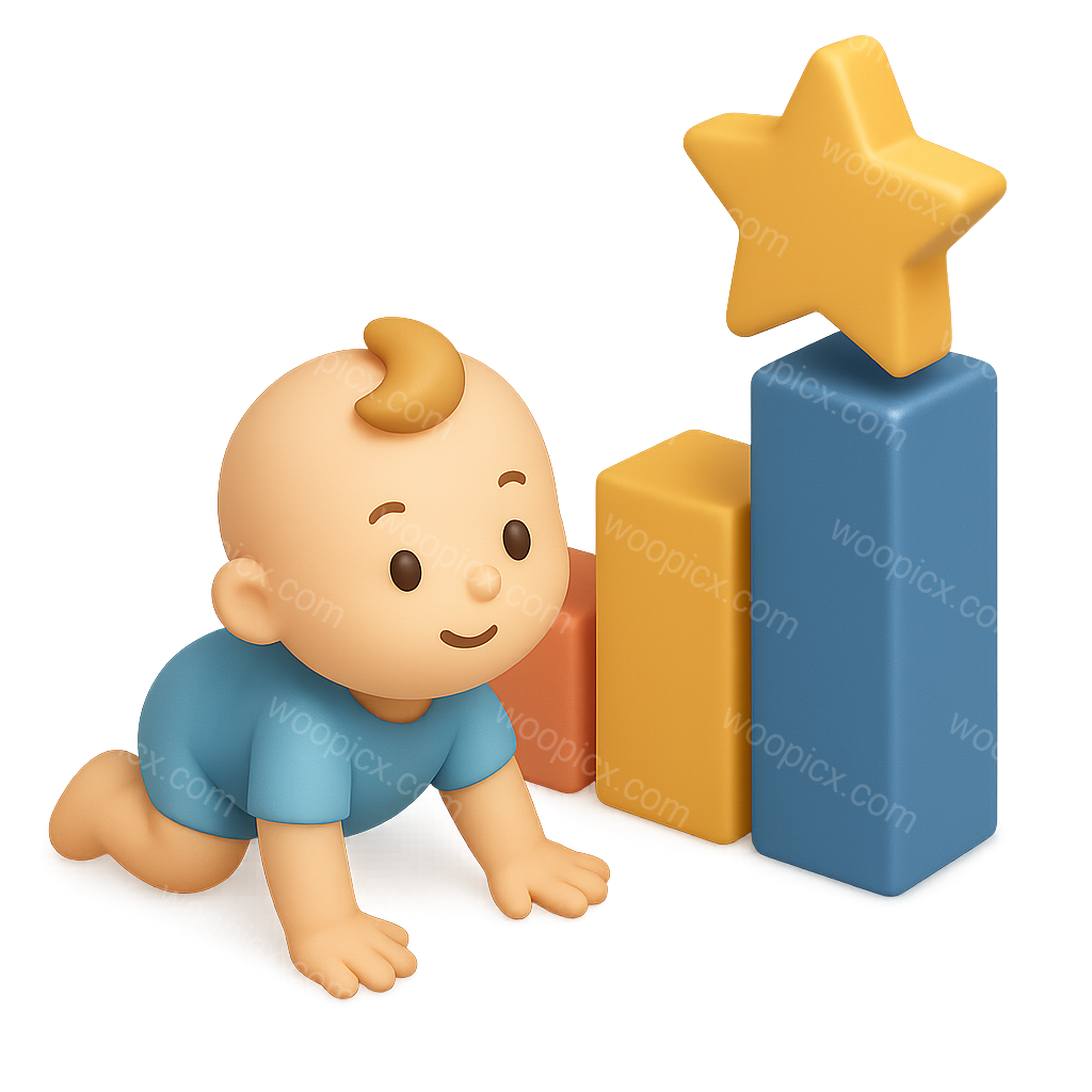 /Premium/Collection: /by davooda/Type: PNG/A cheerful baby crawling next to colorful 3D blocks and a star, symbolizing developmental milestones. The design features a transparent background and an isometric view.