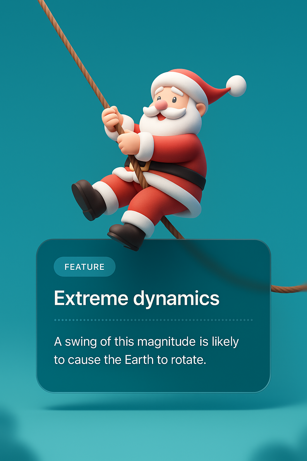 A vivid 3D illustration of Santa Claus swinging on a rope, set against a smooth gradient background. The design includes a feature block highlighting extreme dynamics.