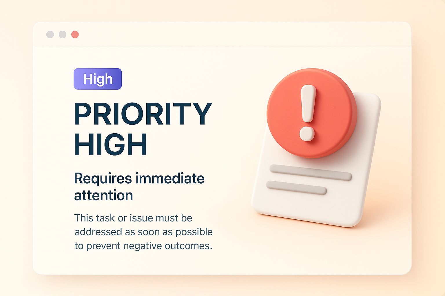 /Collection: /by davooda/Type: PNG/A 3D illustration featuring a priority high notification alert. The design includes a prominent exclamation mark on a white card, with a light gradient background for clarity.