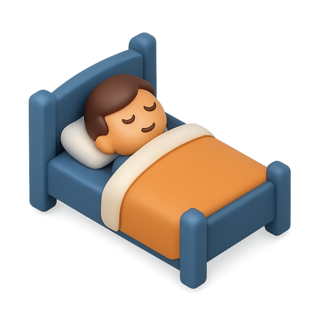 A colorful 3D icon depicting a person peacefully resting in a bed at night. The scene features a blue bed with an orange blanket, showcasing a serene atmosphere.