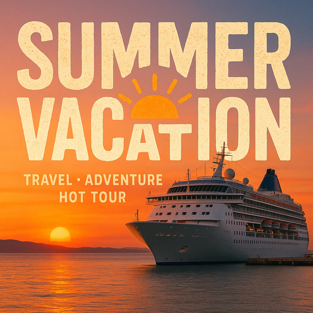 Vibrant Summer Vacation Promotion Graphic Featuring Cruise Ship
