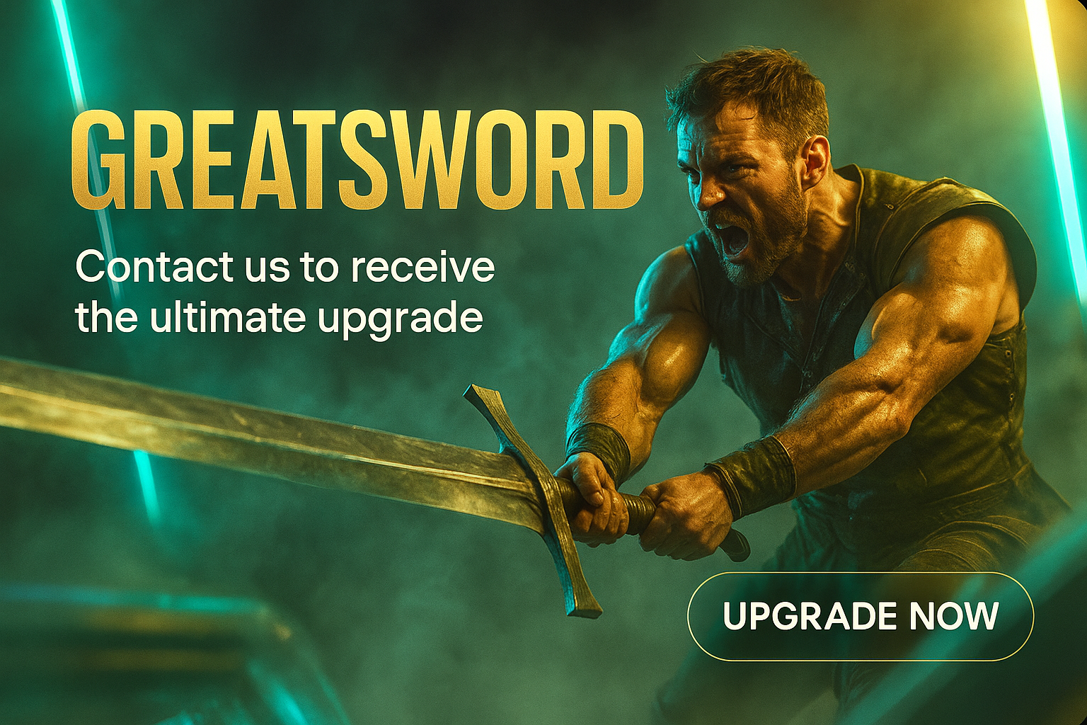 A visually striking slide featuring a muscular warrior wielding a greatsword, set against a neon-lit backdrop. The design includes engaging text encouraging viewers to upgrade.