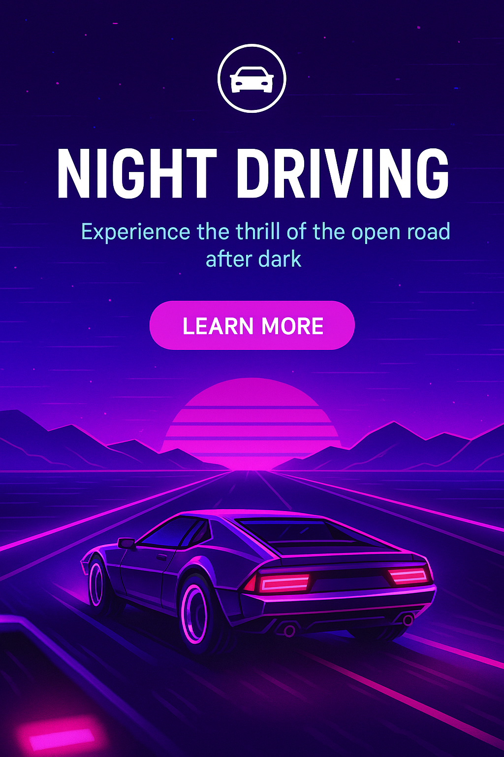 /Collection: /by davooda/Type: PNG/A captivating promotional graphic featuring a retro-futuristic car driving at night, designed with vibrant neon colors. Ideal for marketing campaigns related to driving experiences or automotive events.