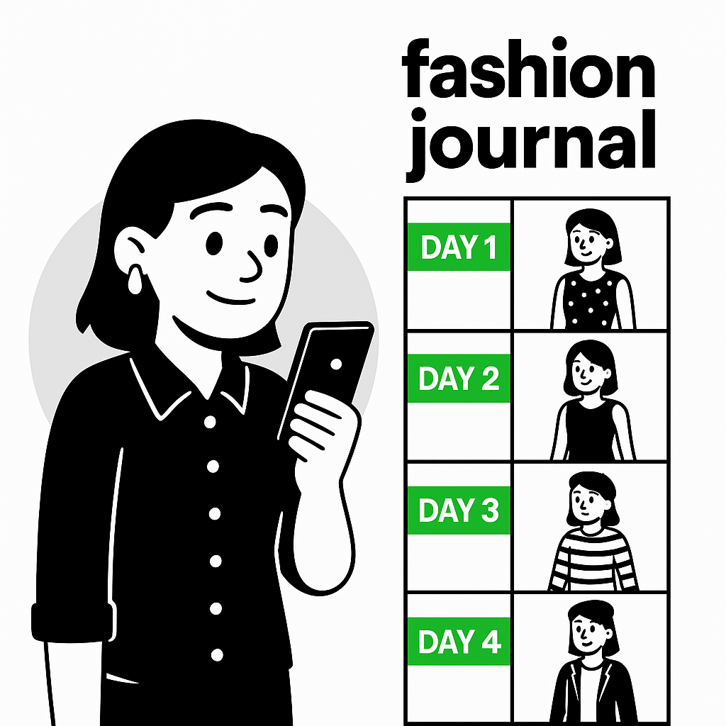 Illustrative graphic depicting a fashion journal theme, showcasing daily outfit choices. The clean design and monochromatic palette make it suitable for fashion blogs or social media.