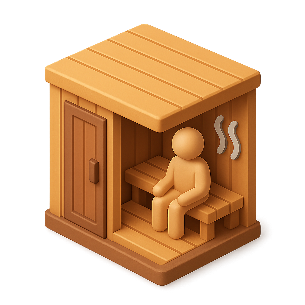 A simple yet appealing 3D icon of a sauna, featuring a person sitting inside. The design showcases a wooden structure with benches and steam symbols, all rendered in a warm color palette.