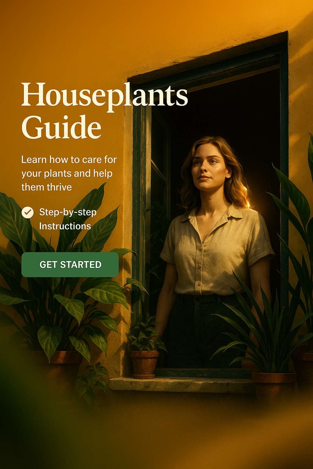 A visually appealing social media post featuring a woman by a window surrounded by houseplants, promoting a guide on plant care with an inviting design.