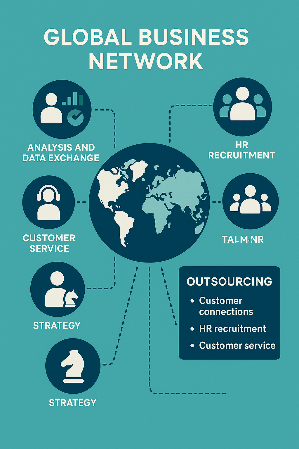 /Collection: /by davooda/Type: PNG/A visually engaging infographic illustrating key components of a global business network, focusing on outsourcing, HR recruitment, and customer service, designed for business professionals.