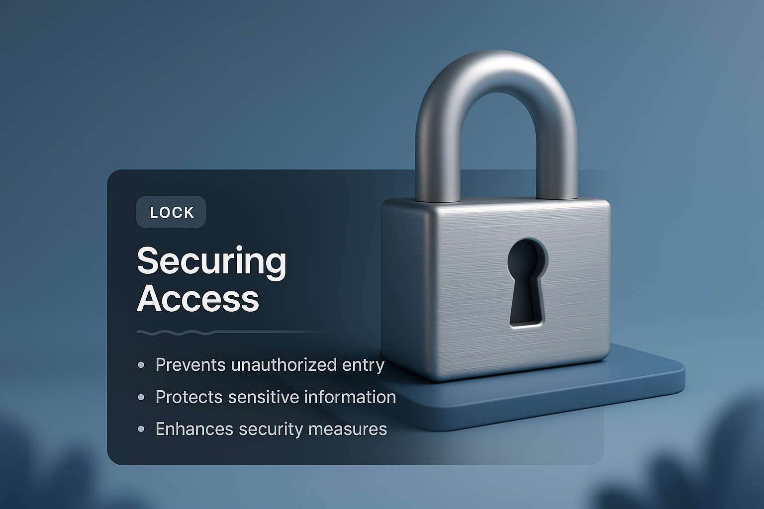 A modern 3D illustration of a lock on a gradient background. The design includes a dark overlay with text highlighting its security features, emphasizing unauthorized entry prevention and information protection.