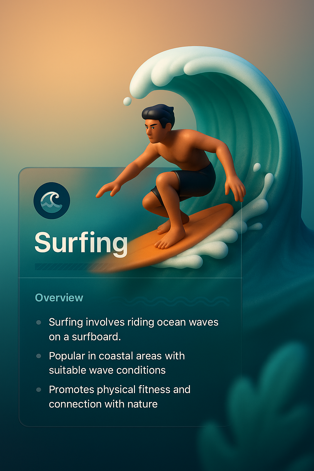 A vibrant 3D illustration of a surfer riding a wave, accompanied by an informative overlay detailing surfing. The design features a gradient background and a transparent panel for text.