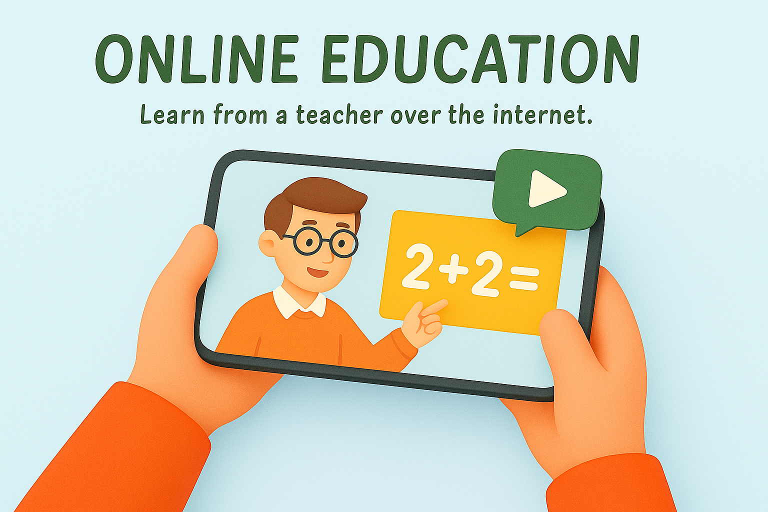 A vibrant illustration depicting a person teaching mathematics through a smartphone, emphasizing online education. This graphic is perfect for promoting e-learning platforms.