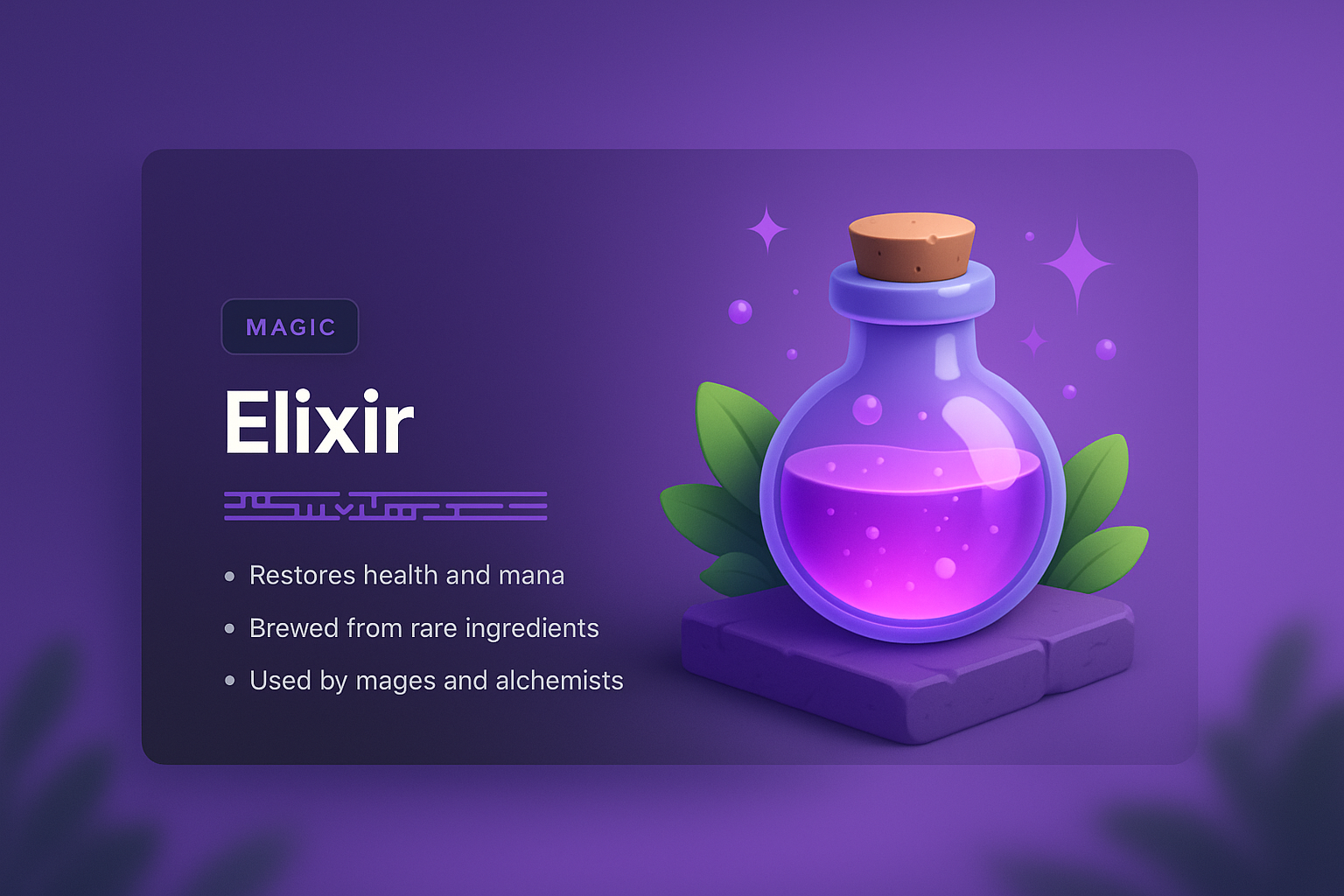 A vibrant 3D illustration of an elixir bottle, set against a gradient background. The design features a dark label, magical elements, and a cohesive layout integrating text and graphics.