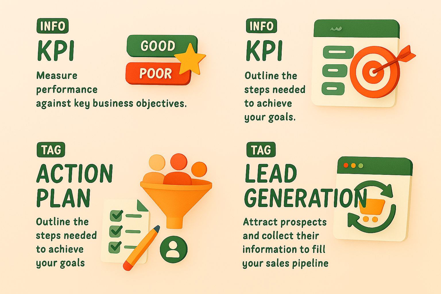 /Collection: /by davooda/Type: PNG/Engaging infographic showcasing key performance indicators (KPIs), action plans, and lead generation strategies with vibrant illustrations, ideal for business presentations.