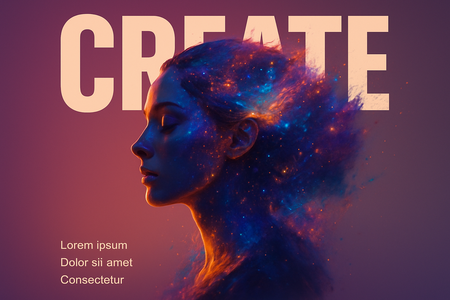 /Collection: /by davooda/Type: PNG/A striking abstract portrait of a woman with a cosmic theme, featuring vibrant colors and digital paint splashes. The design showcases a minimalistic style with a bold headline and subtle gradient background.