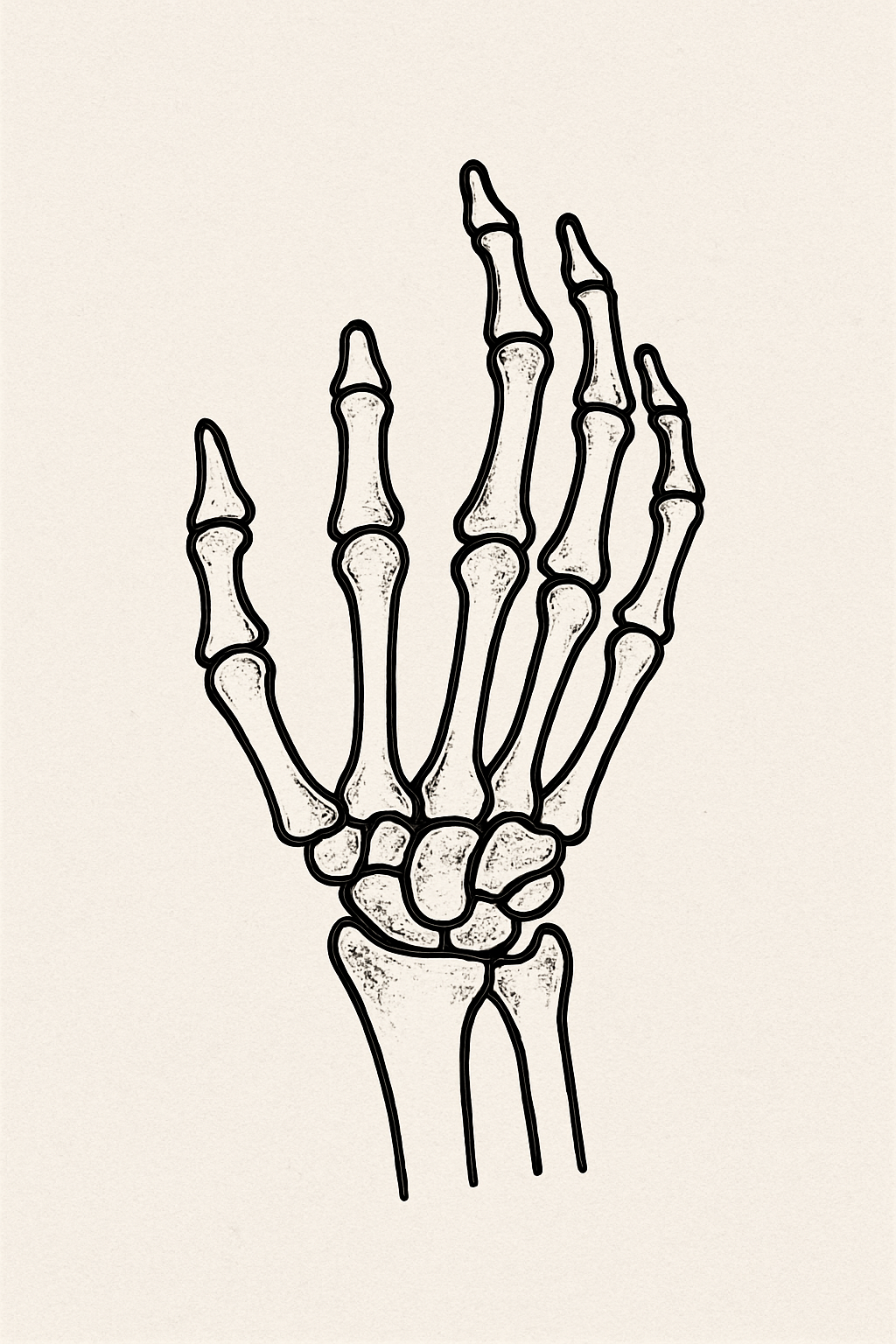 An anatomical illustration of a human hand skeleton, showcasing detailed bone structure. This graphic is suitable for educational purposes in anatomy studies.