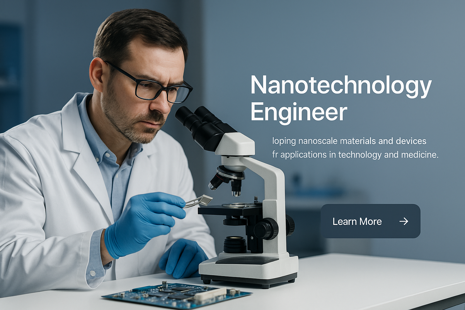 /Collection: /by davooda/Type: PNG/A focused nanotechnology engineer examines nanoscale materials using a microscope. The setting features a circuit board and a clean laboratory environment, emphasizing technology and precision.