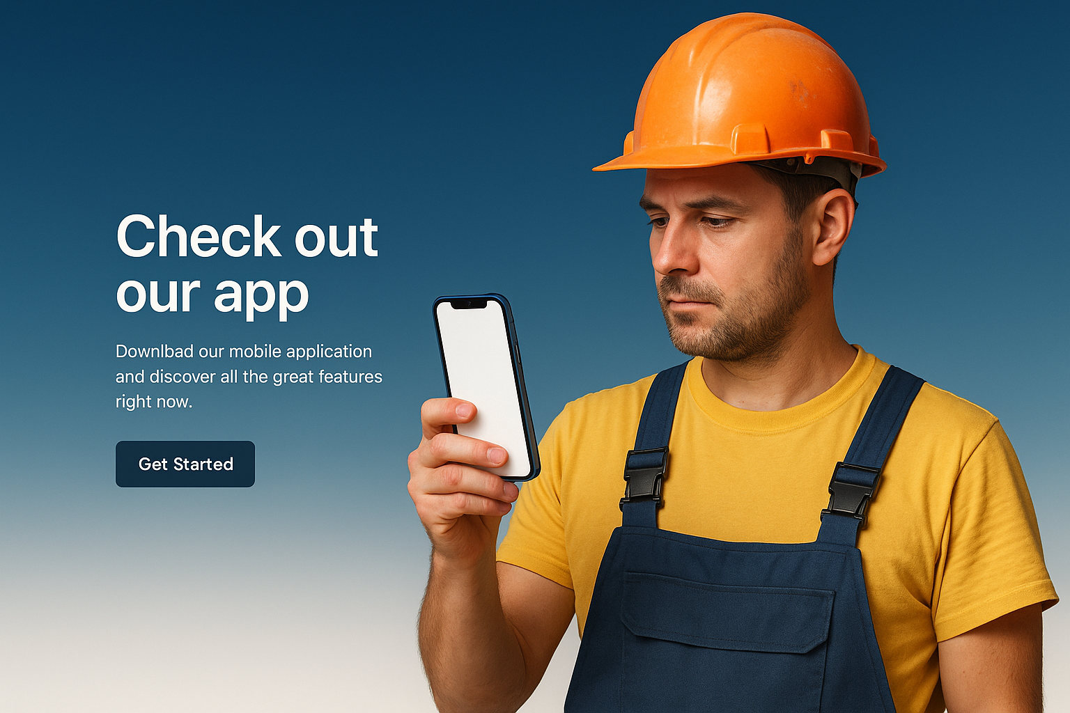 /Collection: /by davooda/Type: PNG/A construction worker in an orange hard hat examines a smartphone. The background features a gradient transitioning from dark blue to white, highlighting the app promotion.