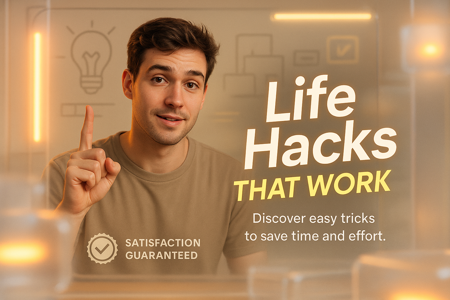 /Collection: /by davooda/Type: PNG/Bright and inviting graphic featuring a young man presenting life hacks. Ideal for social media posts, emphasizing easy tips for efficiency with a modern design.