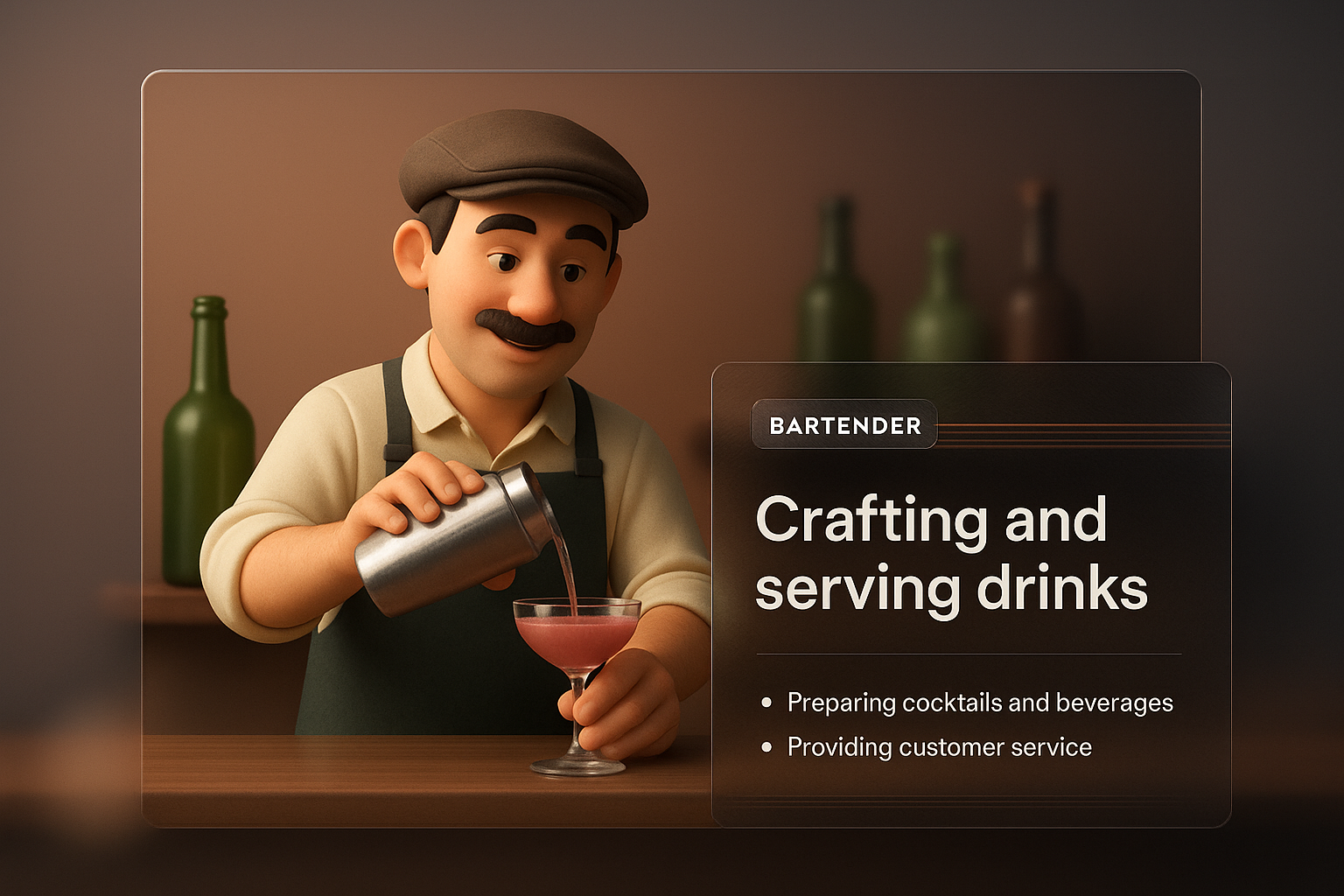 /Collection: /by davooda/Type: PNG/A 3D illustration of a bartender skillfully preparing drinks, complemented by a stylish overlay that includes text and graphics. The design features a smooth gradient background and a modern, cohesive layout.