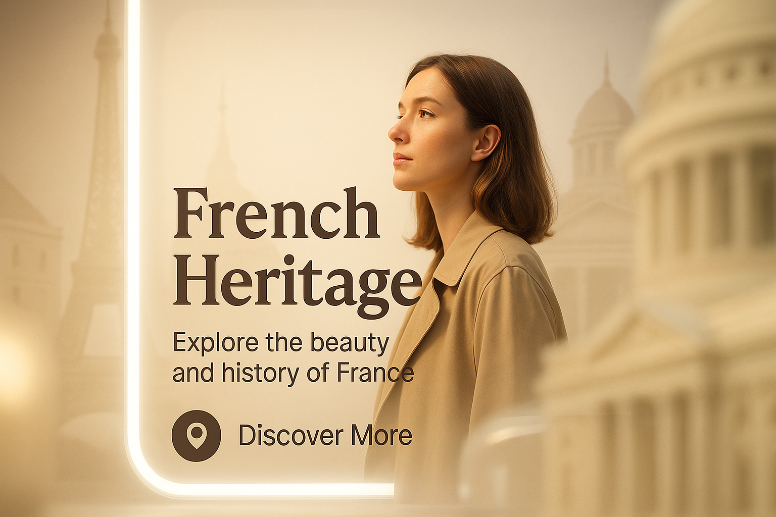 A visually appealing promotional graphic highlighting the beauty and history of France, featuring a thoughtful young woman and elegant design elements. Ideal for tourism campaigns.
