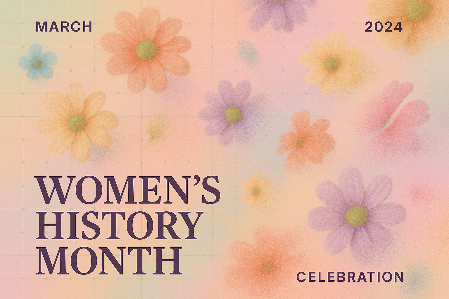A minimalistic card featuring colorful pastel flowers for Women's History Month. The design includes a smooth gradient background and a modular grid overlay, creating depth and texture.
