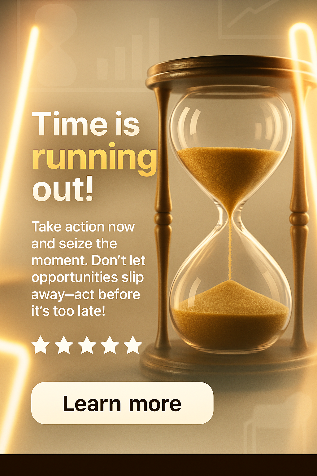 /Collection: /by davooda/Type: PNG/A visually striking LinkedIn carousel slide featuring a realistic hourglass, vibrant neon accents, and a compelling call-to-action. The design emphasizes urgency with a layered composition.