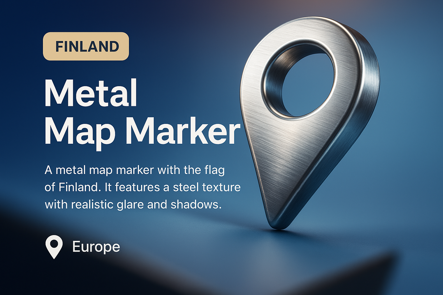 A realistic 3D rendering of a metal map marker featuring the flag of Finland. It showcases a steel texture with intricate glare and shadows, suitable for location-based applications.