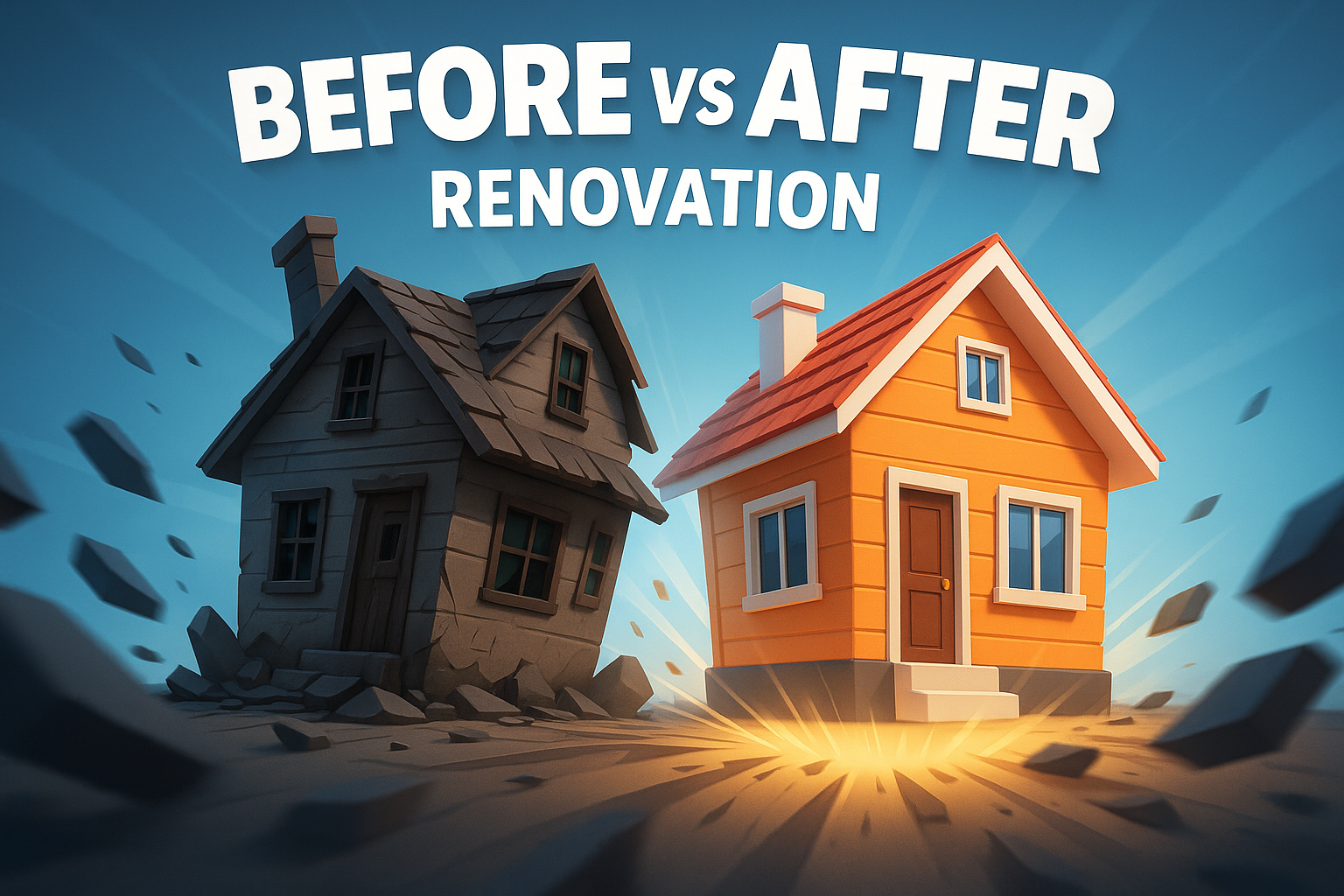 /Collection: /by davooda/Type: PNG/A visually striking graphic showcasing a house before and after renovation. The design features contrasting styles with a dramatic background, ideal for renovation marketing.