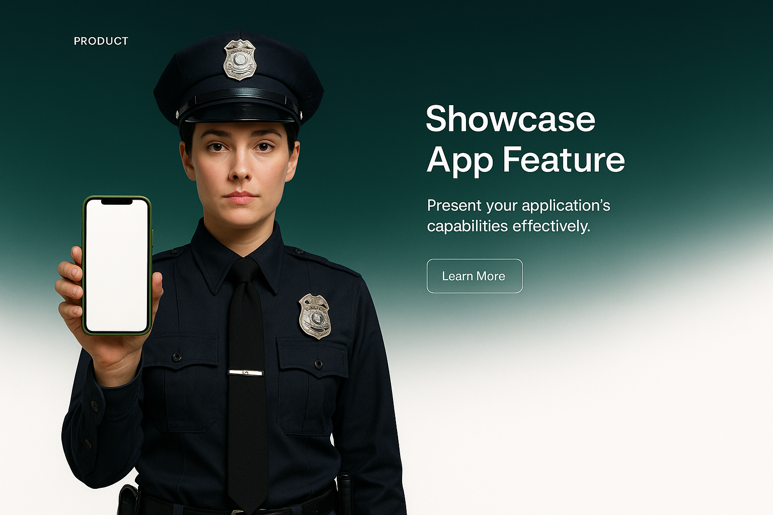/Collection: /by davooda/Type: PNG/A female police officer in uniform holds a smartphone in a professional manner. The background features a gradient transitioning from dark to white, enhancing the image's focus on the officer and phone.