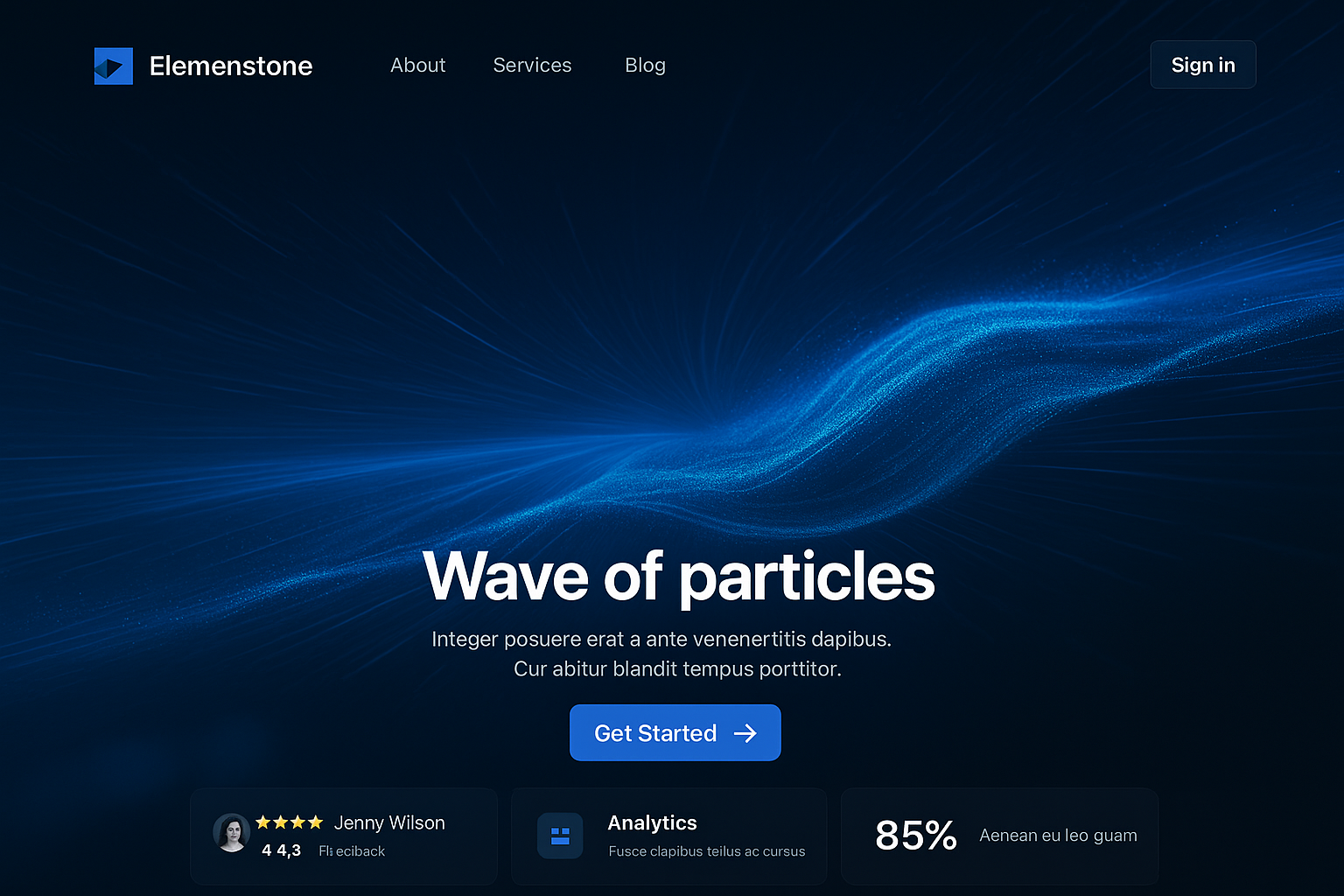 A visually engaging landing page featuring a wave of blue particles, a clear call-to-action button, and a structured layout for services and testimonials.