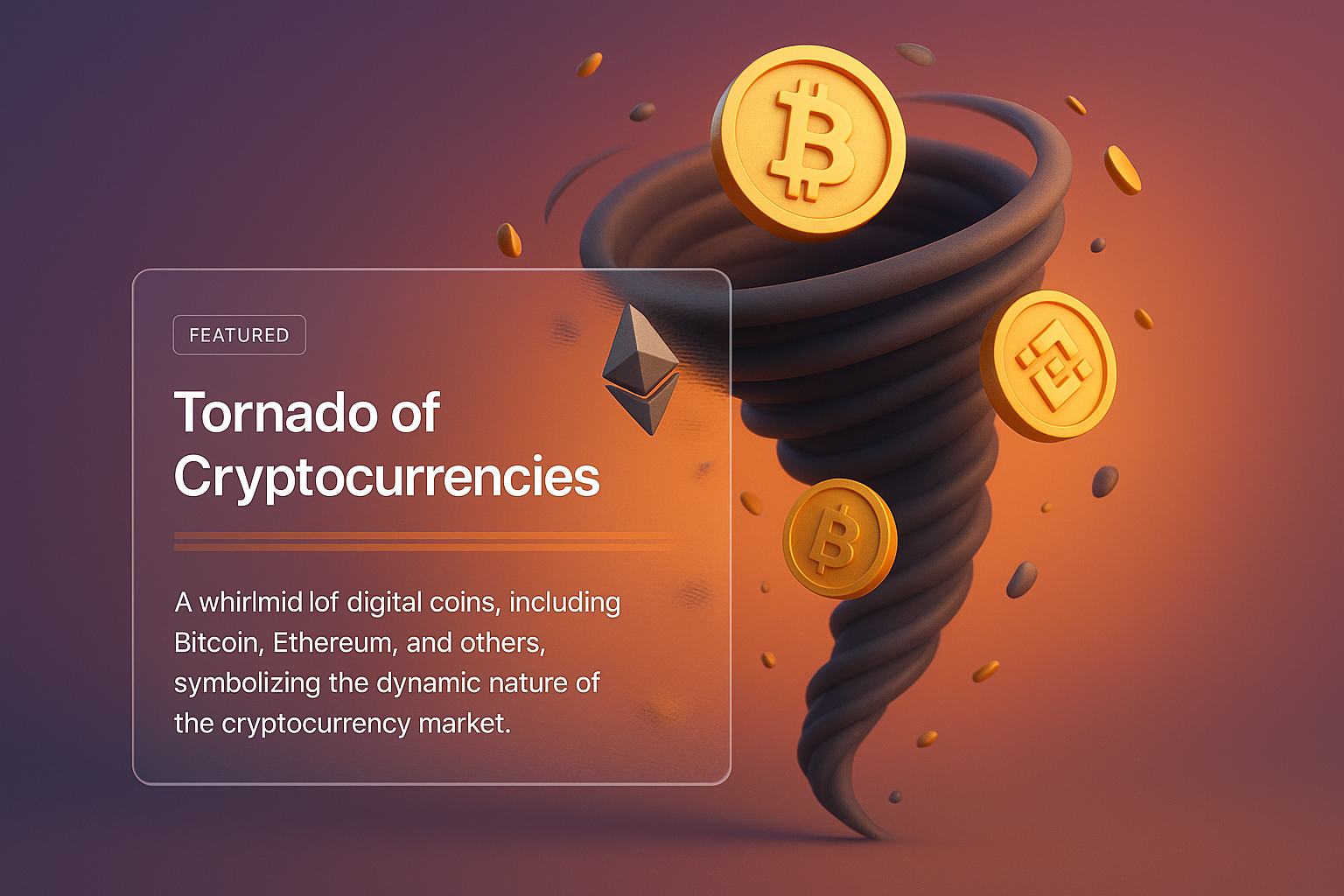 A striking 3D depiction of a tornado made of cryptocurrencies like Bitcoin and Ethereum. The background features a smooth gradient, enhancing the visual impact.