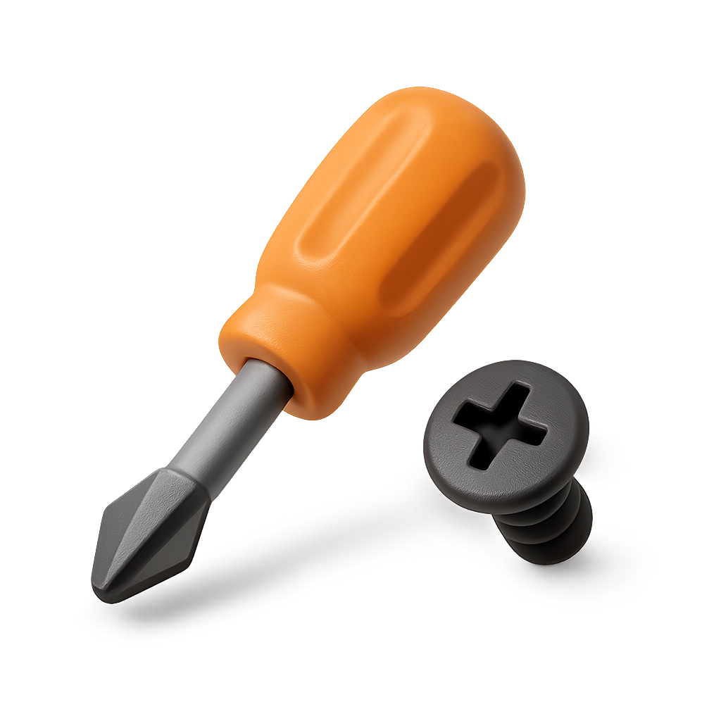 A 3D illustration of an orange screwdriver next to a black screw, designed with a volumetric and isometric perspective, featuring a transparent background.