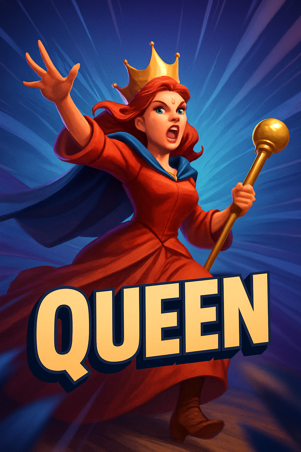 /Collection: /by davooda/Type: PNG/A vibrant and dynamic illustration of a queen character, striking a powerful pose with a scepter, set against a gradient background. The title 'QUEEN' is prominently displayed in bold letters.