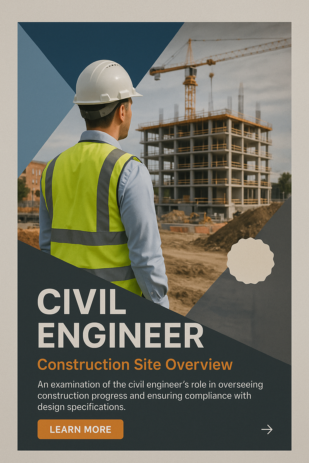 /Collection: /by davooda/Type: PNG/A civil engineer in a safety vest and helmet observes a bustling construction site. The layered composition emphasizes realism with geometric shapes and a balanced design.